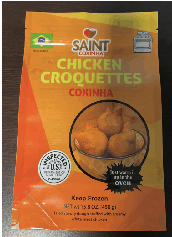 15.8-oz. plastic bag packages containing 15 “SAINT COXINHA CHICKEN CROQUETTES” with “best by” dates ranging “11/04/2025” to “04/19/2026” printed on the back of the packaging.