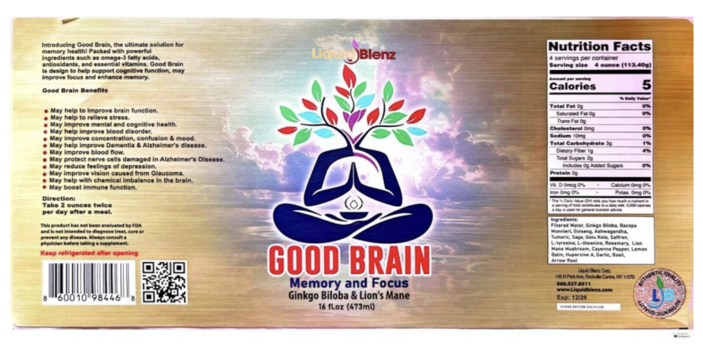 Liquid Blenz Corp. of Rockville Center, NY, is recalling all codes of Good Brain Tonic because of Botulism potential.