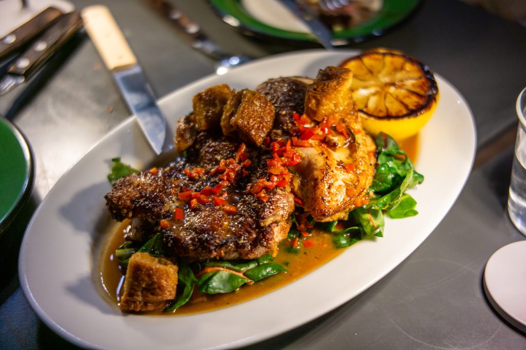 Koji-marinated roast chicken with grilled lemon, Swiss chard, and bagna cauda at Sqirl in Los Angeles. | Matthew Kang